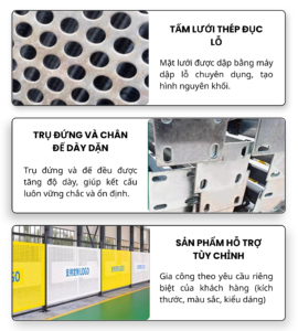 - Tấm lưới thép đục lỗ: Mặt lưới được dập bằng máy chuyên dụng, tạo hình nguyên khối giúp đảm bảo độ bền và sự thông thoáng cho khu vực ngăn cách.