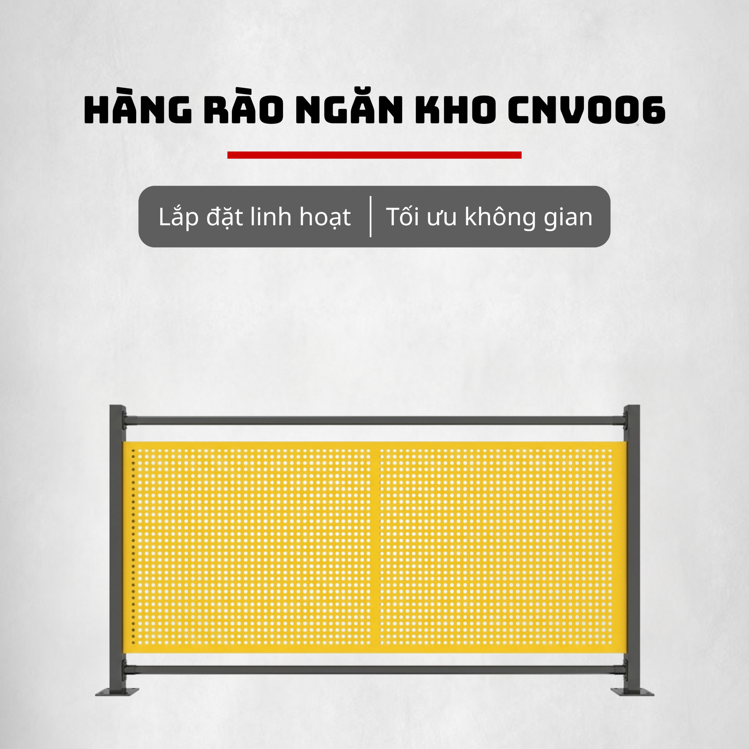 Hàng rào ngăn kho CNV006 là lựa chọn tối ưu, giúp doanh nghiệp dễ dàng phân chia không gian, kiểm soát khu vực và đảm bảo an toàn trong quá trình vận hành, đồng thời mang lại sự linh hoạt và tính thẩm mỹ cho toàn bộ nhà xưởng.